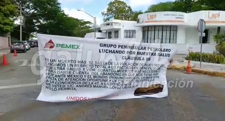 Mérida, 3 de mayo (Infoqroo).- Un grupo de jubilados de Pemex cerró la calle 60 de Mérida, frente al Consulado de Estados Unidos para protestar ante la constante falta de atención en los servicios de salud a los empleados y ex empleados de la paraestatal.